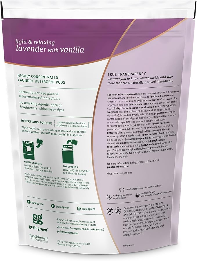 - Contains: 1- 24 Pod Bag of Grab Green Natural Lavender with Vanilla 3in1 Laundry Detergent Pods. Our velcro closure bags are convenient and easy to use, no hassling with frustrating zip closures