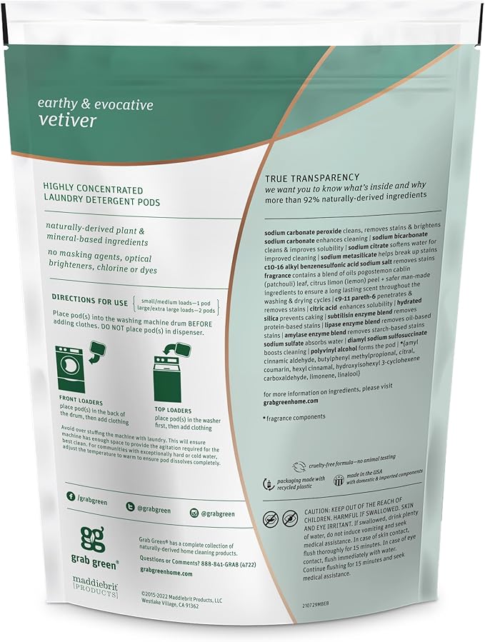 - Vetiver: Our convenient, pre-measured pods provide an evocative and earthy natural fragrance. Just drop one in your washer and deep-clean, remove stains, and brighten, all in one