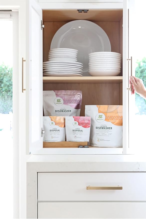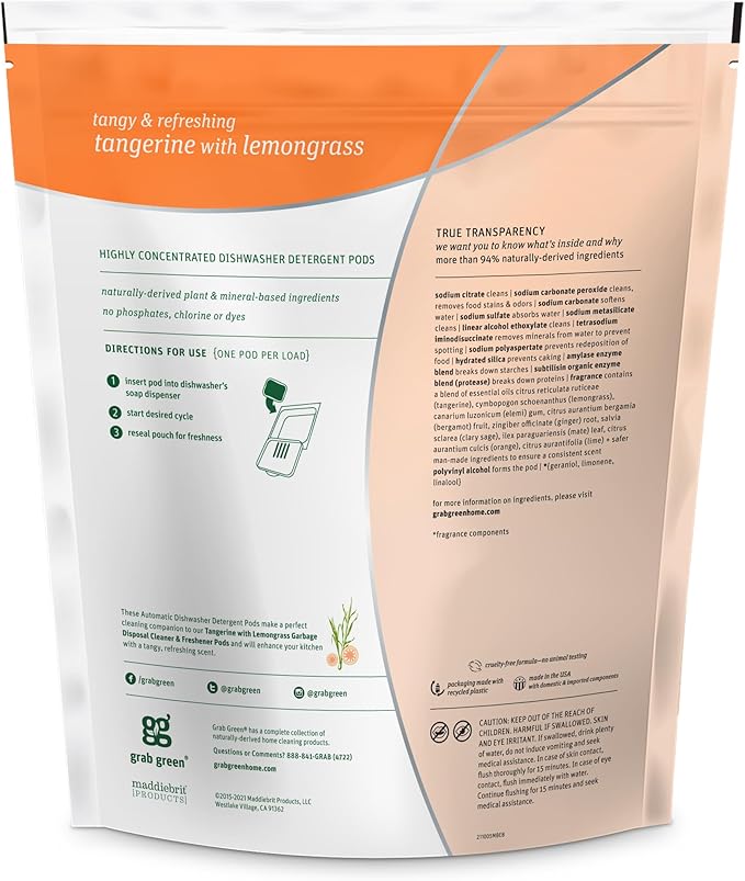 - Contains: 1- 60 Pod Bag of Grab Green Natural Tangerine with Lemongrass Automatic Dishwashing Detergent Pods. Our velcro closure bags are convenient and easy to use, no hassling with frustrating zip closures