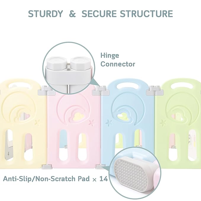 - STURDY & SECURE: Keeps its shape and position thanks to its strong hinge connectors and anti-slip pads; includes a gate with safety lock that allows convenient access and secures your baby inside.