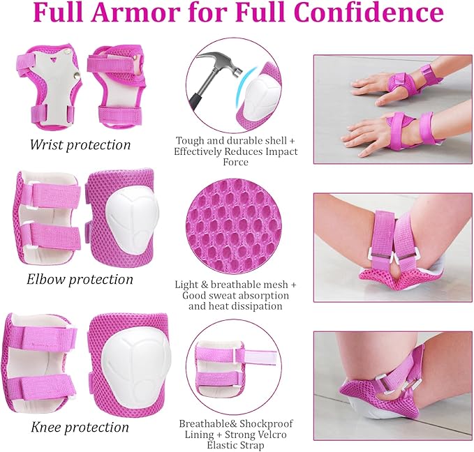 - 【7 pcs Kids Helmet Protective Gear】- Including 1 bike helmet, 2 x Elbow Pads, 2 x Knee Pads, 2 x Wrist Pads. Consist of anti-scratch extra hard ABS shell for hard protection, and adjustable straps ensure the protective gear will not shift. Provides your kids comfortable and safe, A great gift for toddler and kids age 3-8 years old
