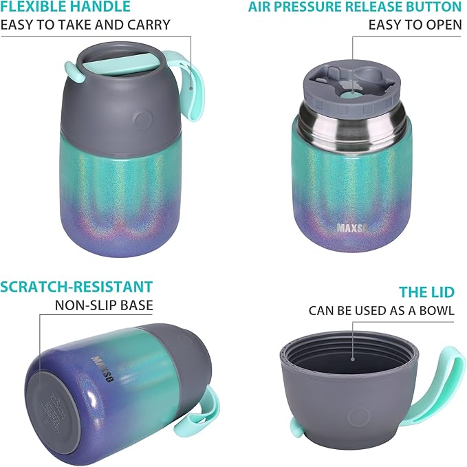 - 【Attractive & Practical Insulated Food Container】It takes top marks for its superior insulation, 304 stainless steel material, BPA free, no PVC, 17oz capacitie and a versatile design that works for toddlers, kids and adults. Use this Insulated food container for hot / cold foods such as pasta, soup, chili or milkshake. It keeps food warm for about 12 hrs and cold for 24 hrs. With our Insulated lunch container, you will never have to endure cold lunches and salads in winter!