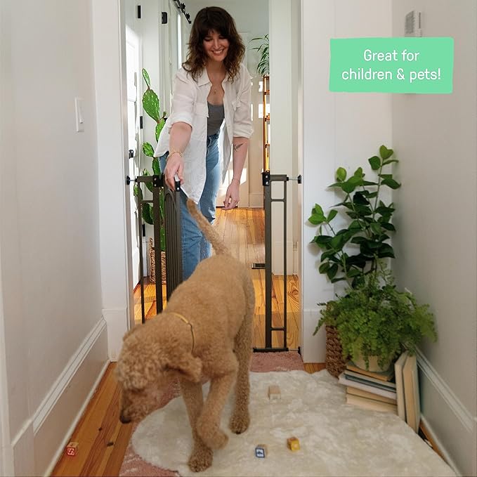 - Lock door securely to keep babies, toddlers, and dogs contained with narrowly spaced bars that prevent them from squeezing through; adults can open door with one hand by engaging the latch and pulling up on the door