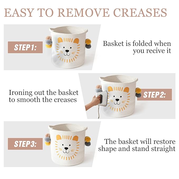 - CUTE EMBROIDERY - Bring a delightful charm to any kids' room with this stylish storage bin featuring a cute embroidered lion pattern design. Not only does it add a playful touch, but it also provides effective storage for various items. The versatility of this container extends beyond the kids' room, as it can be used in the living room, bedroom, bathroom, and more, seamlessly blending with any decor. This package includes 1 cotton rope basket