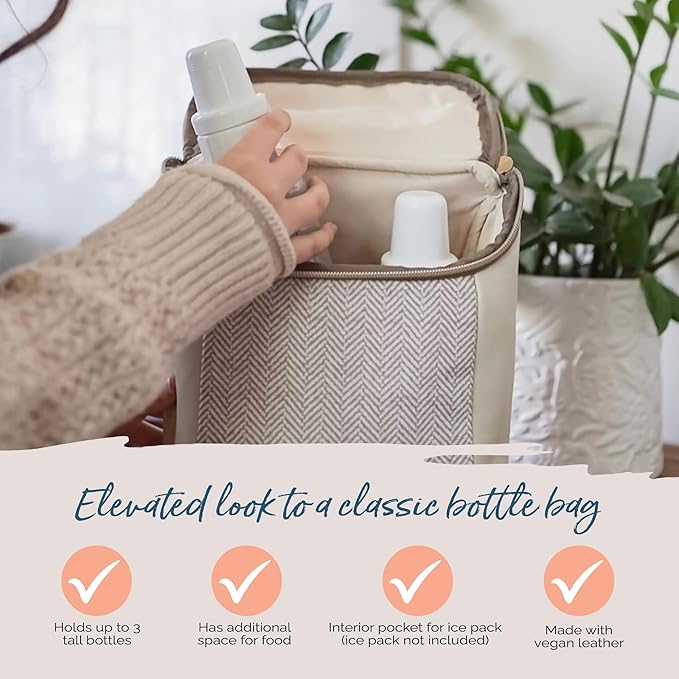 - MULTI-PURPOSE DESIGN: Doubles as a stylish lunch box for parents. This baby bottle cooler bag's compact size and durable vegan leather construction make it an ideal choice for storing and transporting meals, snacks, or beverages for adults too.