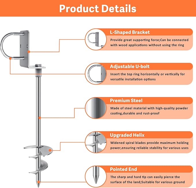 - Adjustable L-shaped head: The trampoline anchors' adjustable L-shaped head with a wide helix provides enhanced stability and prevents movement, even in challenging weather conditions.