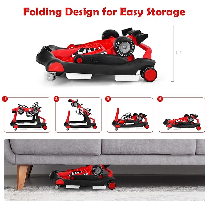 HONEY JOY 4-in-1 Baby Walker, Activity Push Walker w/3 Adjustable Heights, Smooth Wheels w/Adjustable Speed, Padded Seat, Music & Light, Foldable Car Walker for Baby Boys Girls Age 6 Months+ (Red)