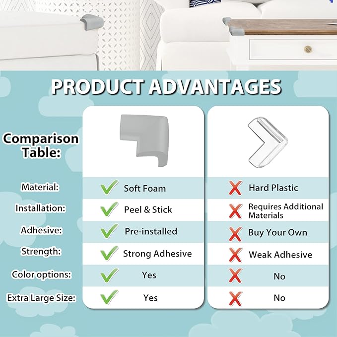 - Wide Application:Corner guards can be used for sharp edges of tables, chairs, furniture and fireplaces, and any hard corner that may cause accidental injuries to our children. Give babies a bigger space to play.