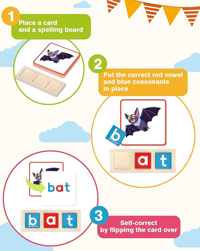- Wooden CVC Word Flash Cards Set: Package includes 50 double-sided phonics flash cards (one side is the word, and the other is the picture), 53 wooden lowercase letter blocks (12 pcs red vowels and 41 pcs blue consonants. The letters q, y, and z are not included because the words of the card do not use these three letters), 5 wooden spelling boards and 1 sturdy storage box.