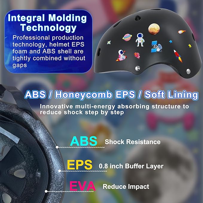 - 【Unique DIY Kids Helmet】 Toddler helmet included space themed stickers, your kids can enjoy and use their imagination to create their own customized bicycle helmet. With knee pads and elbow pads set, effectively protects your kids from injuries during multi-sports, not only protects the baby but also delights the mood. The designed bicycle helmet is a great gift for kids 3-8 years old. (One sticker picture will be given randomly)