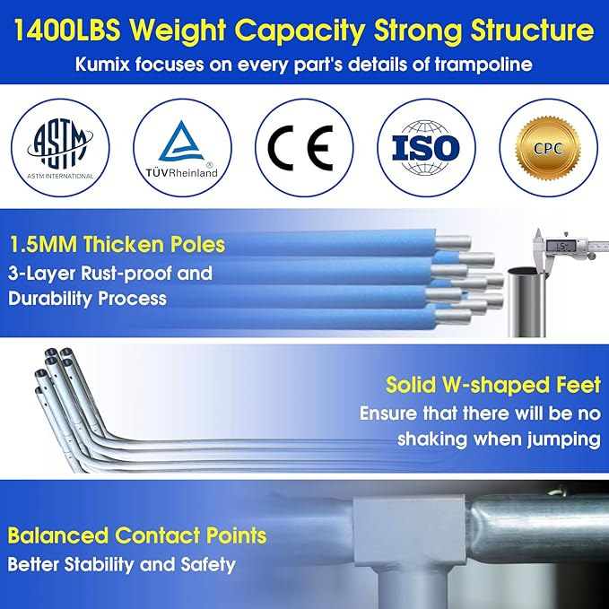 - π1400Lbs Max Weight Capacity: SKYUP 14FT trampoline passed ASTM F381-16 Standard Safety Specification for Components, and CPC, Chemical Test. Due to the 8PCS heavy-duty galvanized steel frame, 4 U-legs, and 80pcs galvanized springs, the trampoline is sturdy and can hold a capacity of up to 6-8 kids. Advise SINGLE person to weigh no more than 330LBS.