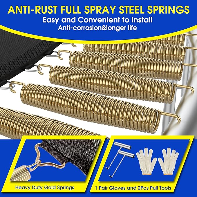 - πUpgrade Waterproof Trampoline Material: Added waterproof and anti-UV safety poles foams which can protect the safety poles away being broken, and extend the lifetime of the trampoline. PP spring pad and high-strength woven jumping mat are also waterproof. Extra including 4 set trampoline wind stakes. Greatly reducing the risk of trampolines being broken in bad weather. Reducing your economic loss.