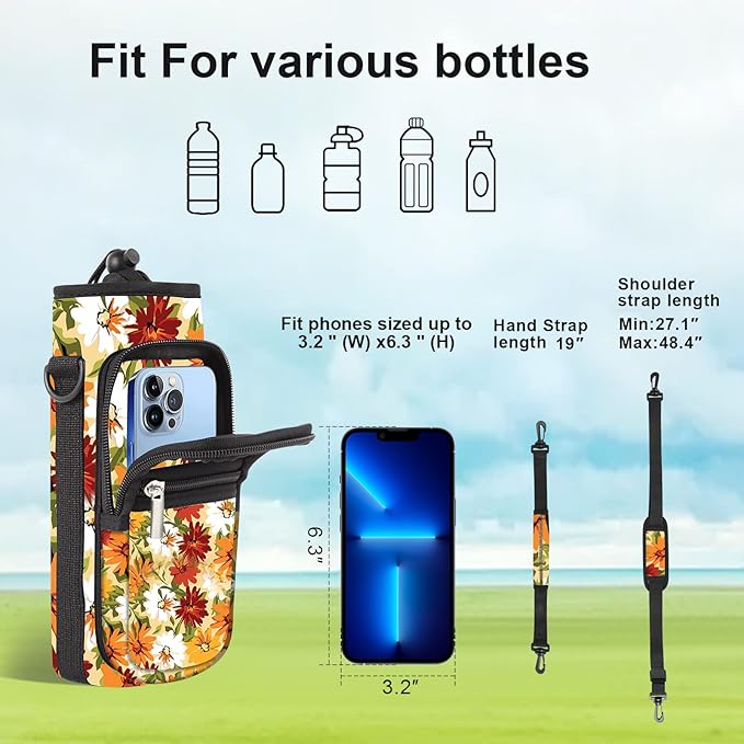 • 【Size】: Our AORTDES water bottle crossbody bag has 4 sizes to choose. 25oz (Max Bottle Diameter 8.2cm ≈ 3.23", Height 23cm ≈ 9.05", Pockets Size 7.48" x 3.93" x 1.57"). 32oz (Max Bottle Diameter 9.7cm ≈ 3.82", Height 20cm ≈ 7.87", Pockets Size 7.48" x 3.93" x 1.57"). 40oz (Max Bottle Diameter 9.7cm ≈ 3.82", Height 23cm ≈ 9.05", Pockets Size 7.48" x 3.93" x 1.57"). 64oz (Max Bottle Diameter 13cm ≈ 5.12", Height 23cm ≈ 9.05", Pockets Size 7.48" x 3.93" x 1.57").