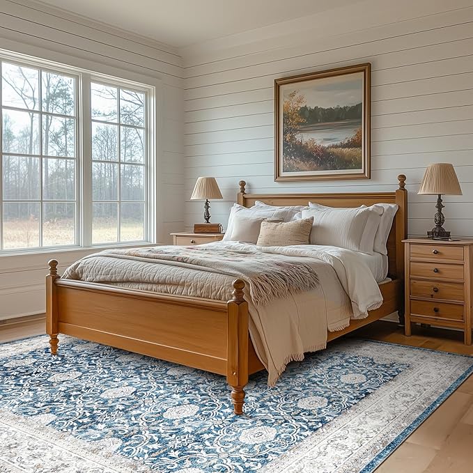 jinchan Floral 8x10 Area Rugs for Living Room Machine Washable Vintage Distressed Boho Design Throw Rug Stain Resistant Carpet Low-Pile Thin Non-Slip for Bedroom Dining Room Nursery (8‘x10',Dark Blue)