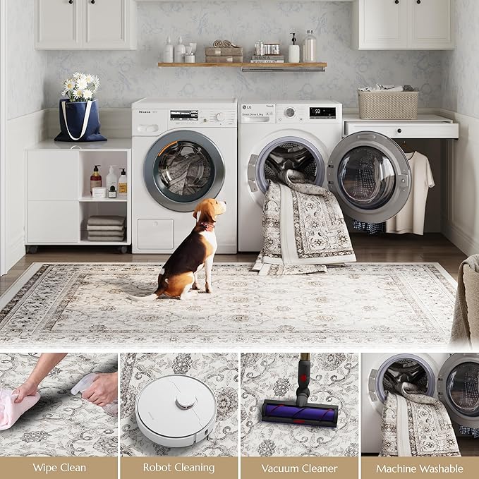 jinchan Floral Area Rugs 4x6 - Machine Washable Vintage Distressed Boho Design Throw Rug Stain Resistant Carpet Low Pile Ultra-Thin Non-Slip for Bedroom Living Room Dining Room Kitchen (4‘x6',Beige)