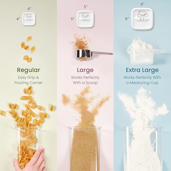 - AVAILABLE IN VARIOUS SIZES & SHAPES: The Felli Flip-Tite container comes in a variety of sizes and shapes to meet different food storage needs. The 4" REGULAR and RECTANGULAR sizes are perfect for organizing small kitchen counters and pantries, making handling and pouring easy. The 5" LARGE size is ideal for storing items like sugar and beans that need scooping. The 6" XL size is specifically designed for storing large quantities of food such as rice, powder, and flour, which require measuring spoons. We offer a versatile storage solution to suit all your needs.