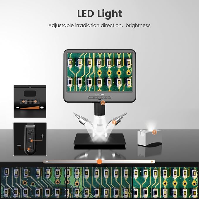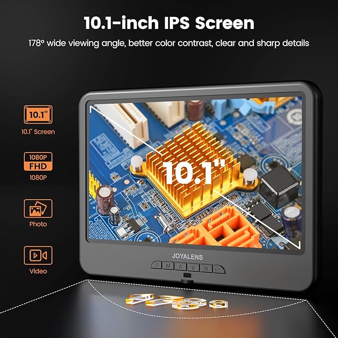 - 【10.1" IPS Screen and 1080P Video Microscope】Featuring a 10.1-inch IPS screen, this microscope is perfect for coin observation, PCB soldering, watch repair, electronics, and DIY projects, allowing efficient, detailed work at a microscopic level. Its 1080P HD video recording and 12MP camera sensor deliver clear image quality, capturing every detail