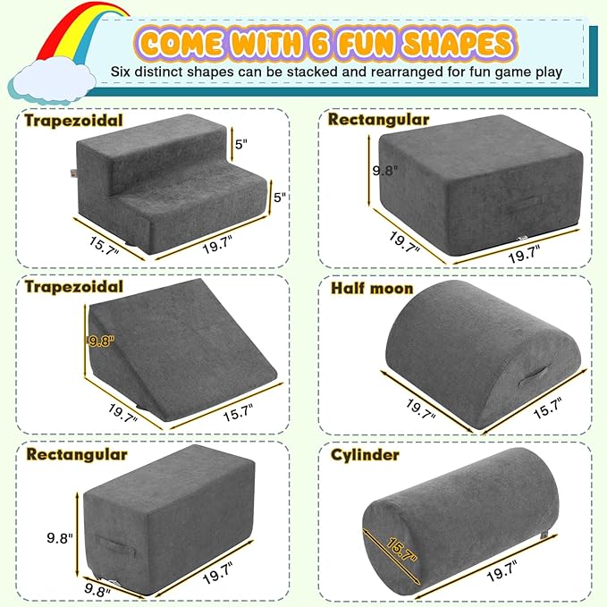 • 【EASY TO SETUP&COLLECT】: The foam climbing blocks set is easy to detach with smooth zippers, hidden zippers and handles to carry considerately designed for kids. machine washable covers, you can wash them anytime for brand-new look. Your babies will absolutely love this soft play equipment! Should you have any query please feel free to contact us , we will reply immediately.