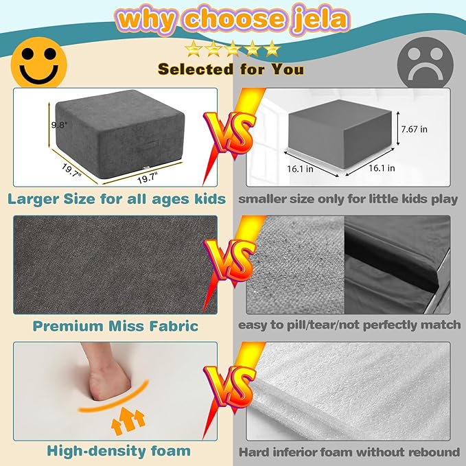 • 【SUPERIOR MISS FABRIC】: These climbing blocks are soft , anti-static, no pilling, non-slip, durable fabric made. Firstly developed miss fabric, have applied to many jela products and tested welcome for this superior quality with nice touch sense and high class texture. We keeps trying to bring products that can meet your practice and aesthetic demands, blending into our kids fun toys.
