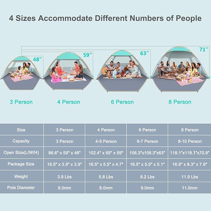 - Super Large Space: Size of 102.4"L x65"W x 59"H, 30% bigger than other POP-UP tent at similar price, fits 4-5 person. It provides a comfortable space for family and friends on the beach