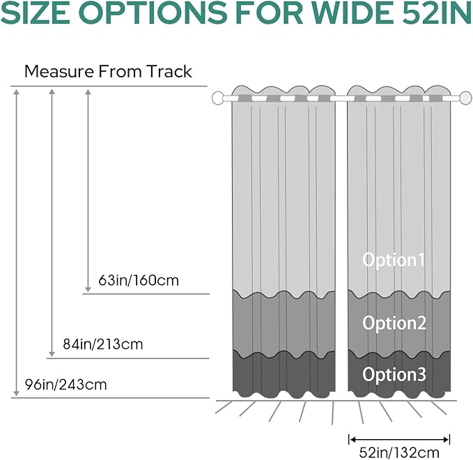- ★【ABOUT PACKAGE INCLUDE】Your package includes 2 panels of ombre curtains, each panel measures 52 inches in width, a total width of 104 inches. 8 silvery grommets(1.6-inch inner diameter) of each panel make the blackout curtains easy to install and slide.