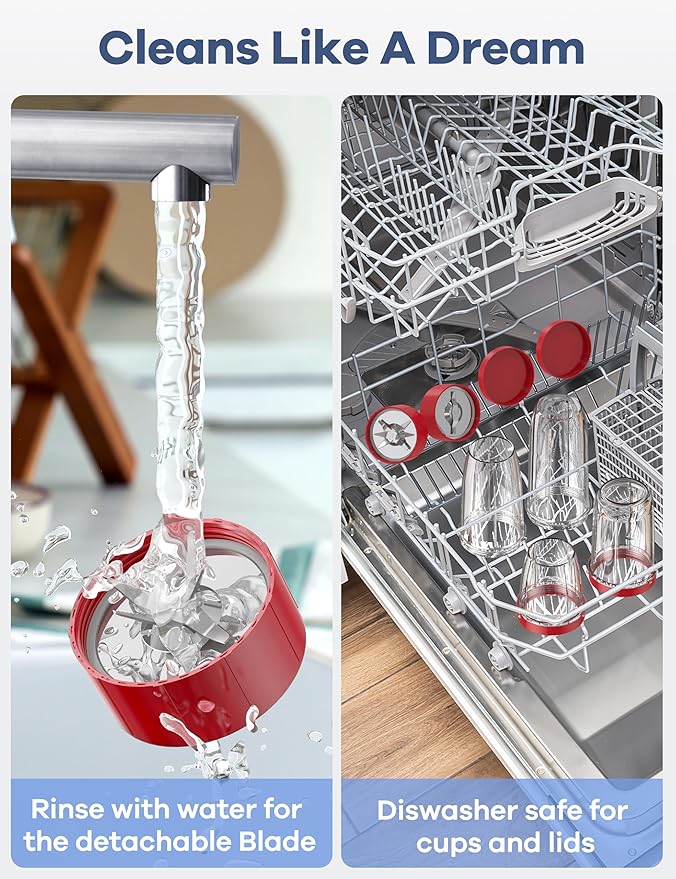 - 【Cleaning Friendly】Cleaning is a breeze – just add soap and warm water, and the blender will start its self after properly locked into the base. In addition, the smoothie maker can be easily cleaned in a dishwasher, except for the motor part (The Main Body).