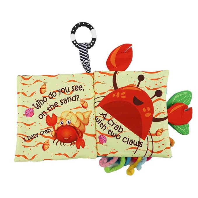 - Baby Books 0-6 Months, Interactive Activity Fish Book: Be a child once again! Lift-the-flap,play peek-a-boo, Search for hidden surprises in the crinkle books,Touch and feel textures,gaining self-awareness & discovery through baby mirror toy & enjoy crinkle pages! This baby toys 3-6 months, soft fabric book encourages adventure & discovery of the colorful undersea world.Your baby will be attracted by 3D baby octopus toy,sea animal,baby crab & fishy tails.You can watch her/his little eyeβs dance!