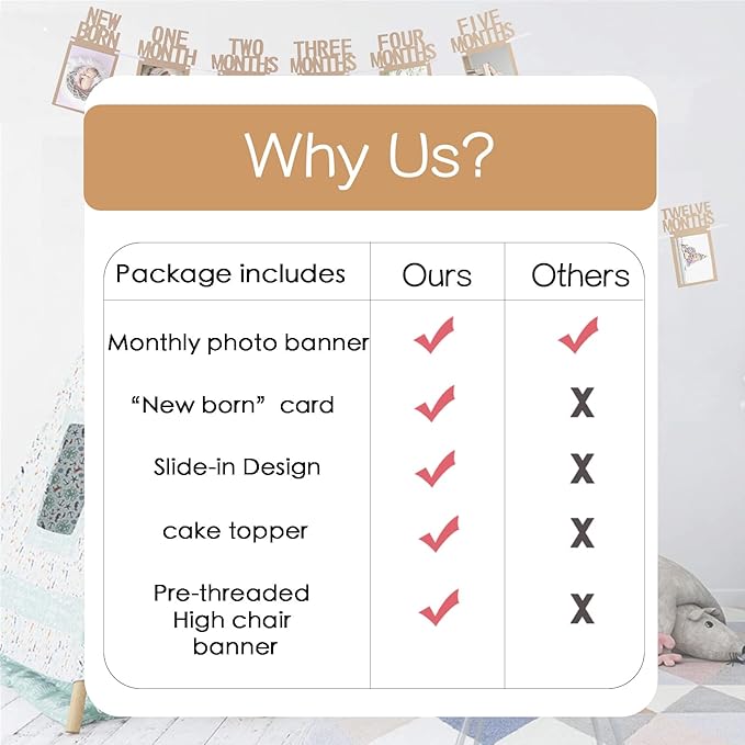 - Why Us: First all, a lot of sellers use glue to stick the photos to the banner, which is easy to fall off and damage your precious photos; Second, they don't include the "NEWBORN" card and we have; The last, many of them only sell the monthly photo banner at the same price, but we offer more! The "One" high chair banner and "One" cake topper are cherries on the top, to make your baby birthday a bit more beautiful!