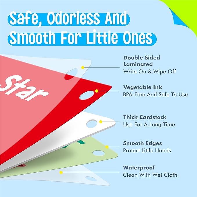- Well Made: The card adopts sturdy and thickened paper material with PET film on both sides, durable and tear resistant. Printed with premium non-toxic vegetable oil-based ink, BPA-free and safe for kids to use. Bright colors and cute designs catch kidsโ eyes and evoke a sense of excitement and joy. When children are surrounded by these colorful flashcards, they are more likely to be engaged and interested in what they are learning.