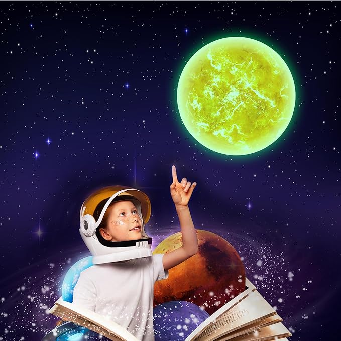 - Robmoda Glow in The Dark Planet - One piece of sun sticker made up of non-toxic, eco-friendly, waterproof, pressure resistant, shock resistant& durable fluorescent PVC. It comes in 23.5 cm (9.25β).