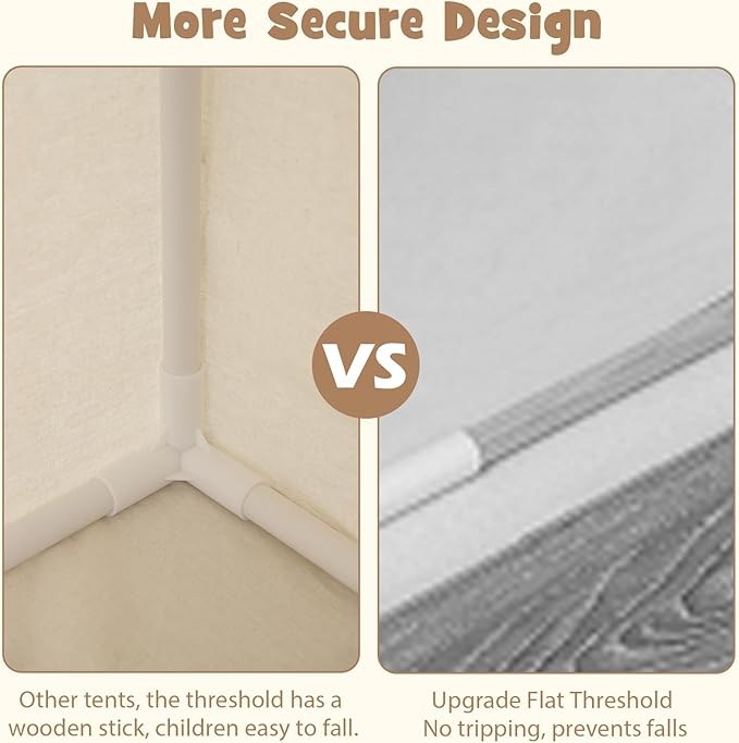 - ✨ANTI-TRIP DESIGN:Our children's tent is different from other tents in that the door is designed to be invisible threshold. Tent bottom close to the ground, children in and out of the tent will not trip or fall, very safe and reliable. Generally, the threshold of the tent door is a stick or a round pipe. When the children get in and out, they are likely to get wrestling.