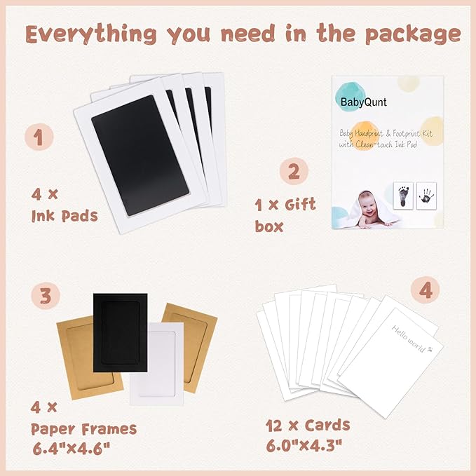 • 【Product Details】: Our baby hand and footprint kit measures 6.0"x4.2" with an ink window of 4.9"x3.1", which is the best size for recording hand and footprints of newborns 0-6 months old or pet paw prints . The ink pad for baby hand and footprints includes 4 clean touch ink pads, 12 stamping cards, and 3 display frames, ensuring you have ample opportunity to capture the best stamp.
