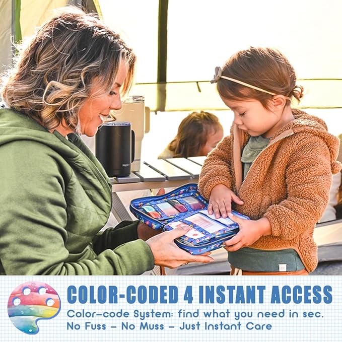 - π Travel-Friendly Organization: Our first aid kit is meticulously designed to ensure quick access during travel emergencies. Our supplies are neatly organized in designated compartments, all in one compact and portable storage bag, allowing for quick grabs during emergencies, making it perfect for parents on the go!