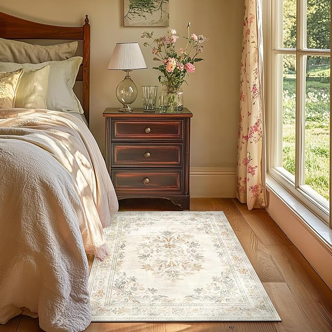 jinchan Vintage Floral 3x5 Area Rugs for Entryway - Machine Washable Distressed Design Ultra-Thin Low-Pile Soft Non-Shedding Carpet for Kitchen Bedroom Entrance Laundry Living Room (3x5ft,Light Grey)