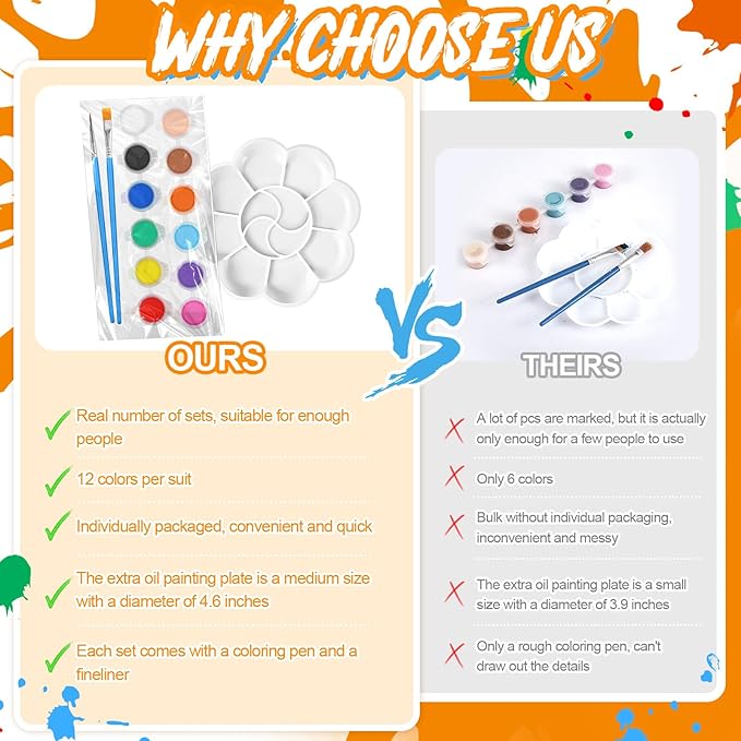 - Kids Painting Set: you will receive 96 sets of painting party favors for kids and adult beginners, which include 96 filled paint strips in 12 different colors, 192 paint brushes (96 flat brushes and 96 pointed brushes) and 96 palettes; All things fully meet the different needs of painting and coloring