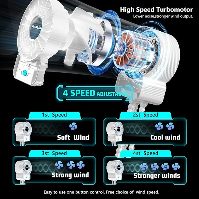- 【4 Speeds and Quiet】-AaoLin small portable fan built-in high speed brushless motor,It can provide powerful airflow but is quiet.It comes with 4 speeds for different purpose,Its highest gear has a speed of 6600rpm.Summer gifts for kids,travel beach cruise ship essentials,very practical stroller accessories!