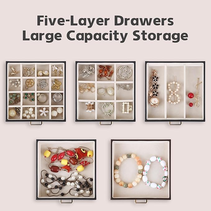 Kendal Jewelry Box, 6-Layer Jewelry Storage Organizer for Necklace Bracelet Rings Watch, 10.2"x8.2"x6" Classic Black PU Leather 5 Drawers Large Storage Capacity with Mirror