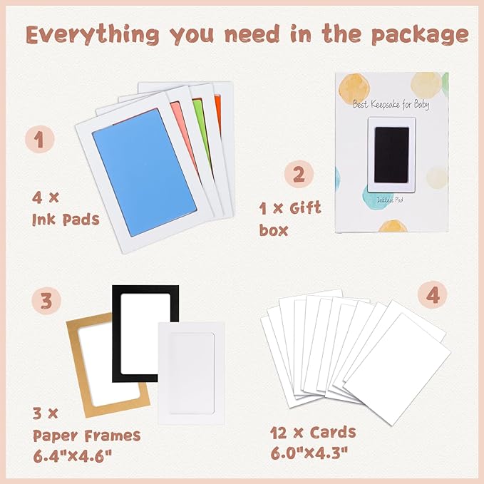 • 【Product Details】: Our baby hand and footprint kit measures 6.0"x4.2" with an ink window of 4.9"x3.1", which is the best size for recording hand and footprints of newborns 0-6 months old or pet paw prints . The ink pad for baby hand and footprints includes 4 clean touch ink pads, 12 stamping cards, and 3 display frames, ensuring you have ample opportunity to capture the best stamp.
