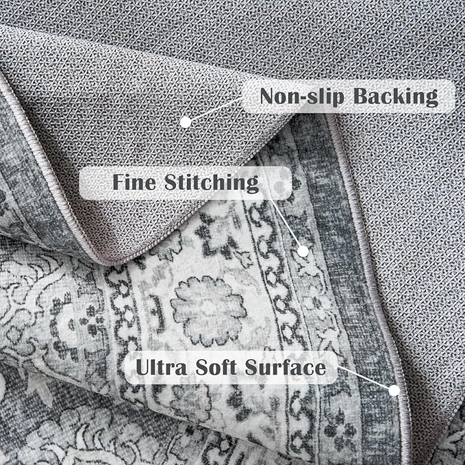 jinchan Round Rug 4ft Washable Circle Soft Rug - Low Pile Vintage 4'Round Indoor Grey Floral Print Stain Resistant Boho Carpet Ultra-Thin Non-Slip for Entryway Nursery Bedroom Dining Room Kitchen