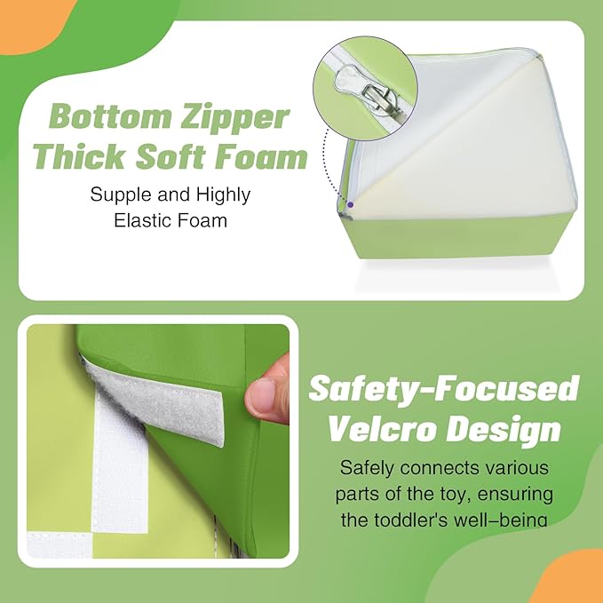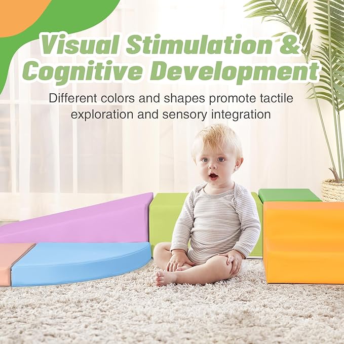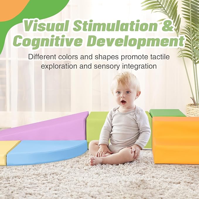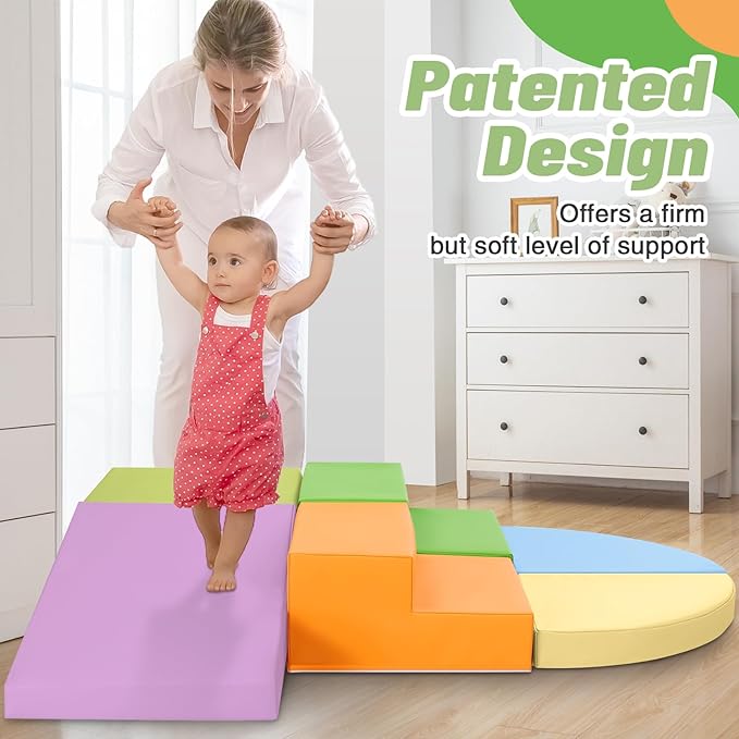 - 6-Piece Set: Baby climbing blocks consists of 1 yellow half-moon, 1 blue half-moon,1 orange stair, 1 green stair, 1 grass green square and 1 purple slide. This soft play equipment stimulates your child's imagination to create endless combinations of structures, allowing them to enjoy the fun of the toy as they climb up and down, stacking and swapping four different shapes. Our climbing sets have a unique patented design that your child is sure to love