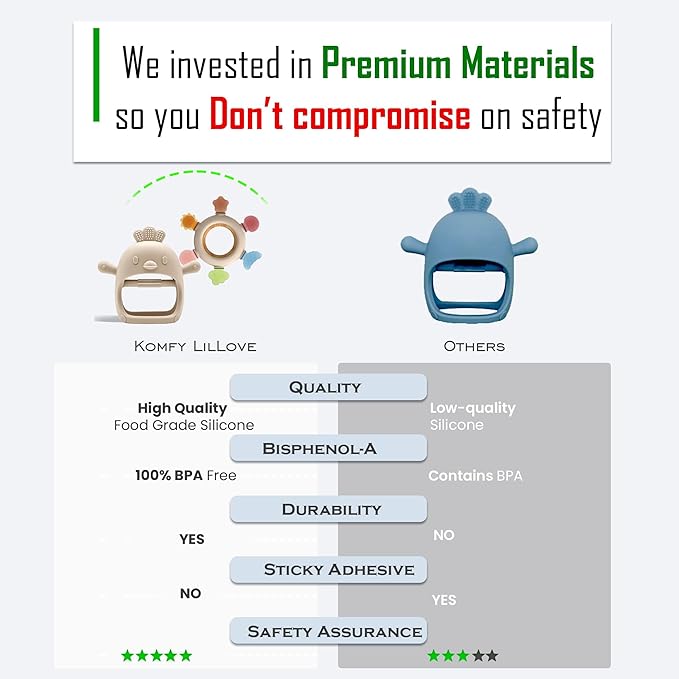 - Soothing Teething Relief for Little Hands: Komfy LilLove silicone chick-shaped hand teether and silicone ring teether for babies are made to fit securely on small hands, making them perfect for little ones who canโt hold regular teethers yet. The built-in grip bar of our baby teething toy helps them grasp better, while the soft silicone texture protects tiny fingers. The playful character arms mimic a nipple to calm fussy babies.