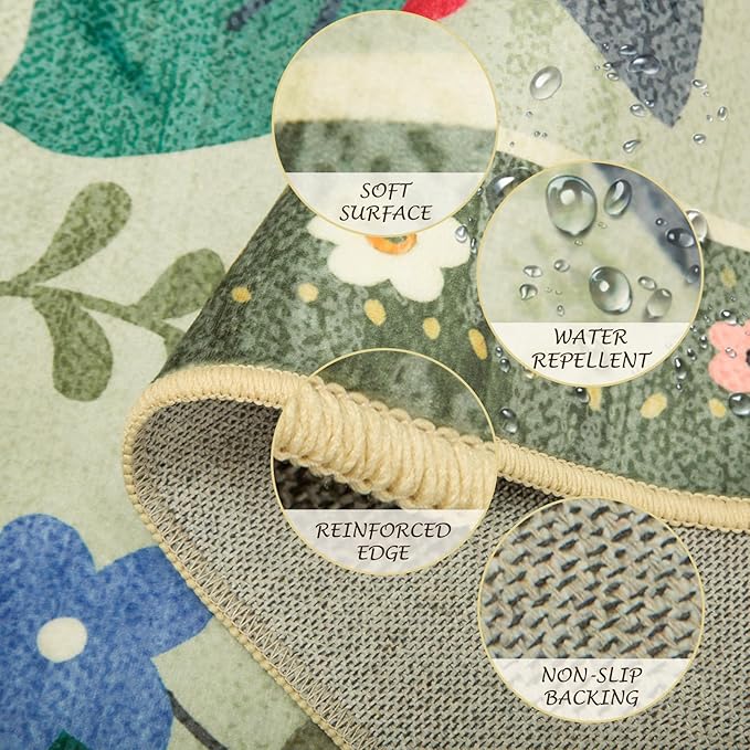 Floral 4x6 Area Rug Machine Washable Soft Print Boho Carpet Non Slip Doormat Low Pile Flower Area Rugs for Living Room Bedroom Nursery Kitchen Dining Room Indoor-Light Green