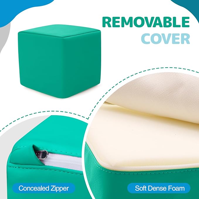 - Easy Maintenance: The surface material of blocks is PU leather. Each foam block features a removable, washable fabric cover, ensuring cleanliness after hours of play. Designed for durability, they quickly regain their shape after being compressed during shipping, ready to create a vibrant toddler zone filled with colorful softscape adventures