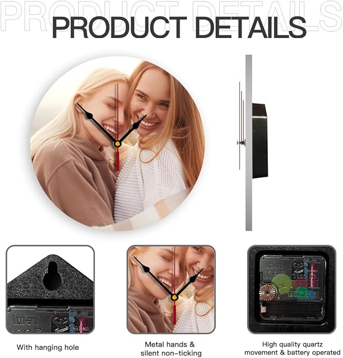- 【Personalized pictures clocks】Please click the“customize now“button at upper,upload your customized photo and add text.Stretch photo to fill the entire printing area.Submit high definition images for better print results.