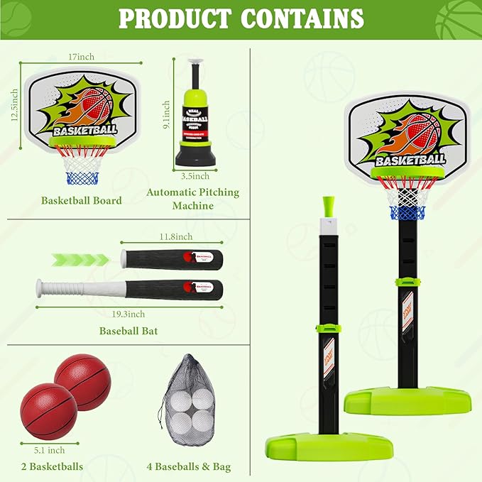 - 【3 WAYS TO PLAY】①Basketball Hoop: Equipped with 2 high-elastic basketballs to make playing basketball more fun. ②Baseball Tee Stand: Ideal for helping kids practice batting skills and improve hand-eye coordination. ③T Ball Automatic Launcher: Baseball bounces automatically and hits the baseball quickly, making the game challenging and fun