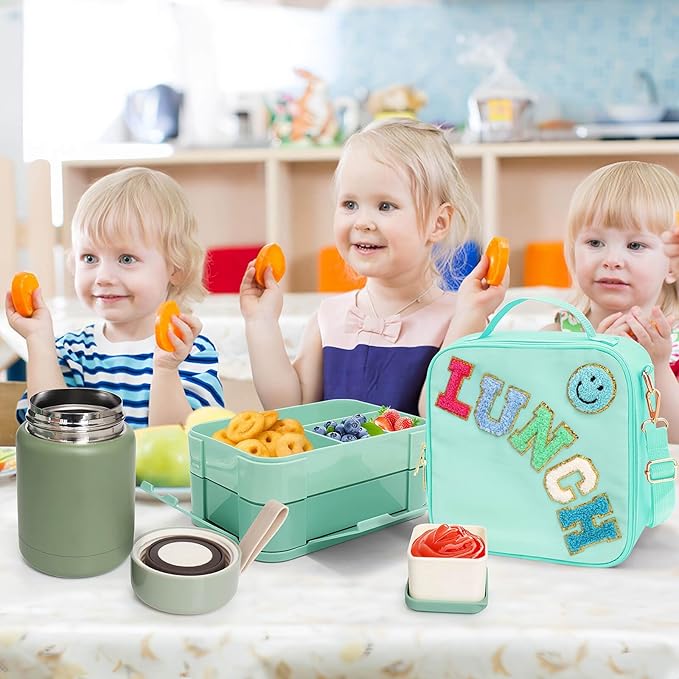Girl Lunch Bag with 6 Compartment Bento Box with 10oz Thermo- Preppy Green Nylon Insulated Lunch Box Adjustable Strap, Birthday Gift For Girl Kids Teens Travel Picnic School