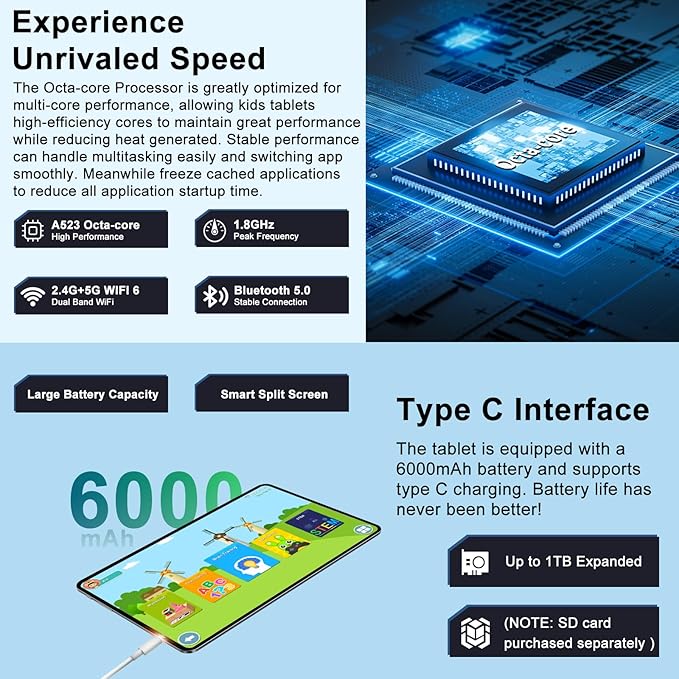 - 【20GB (6+14) RAM and 128GB Super ROM & 6000mAh Large Capacity Battery】 20GB ( 6GB Original + 14GB Expanded Virtual ) RAM + 128GB ROM (SD card expandable up to 1TB), it is able to run various apps compatibly and smoothly, and store your child's favorite movies, photos and apps, such as Kindle,Instagram,Disney+ and other daily required apps directly from the pre-installed play store to meet your child's diverse learning and entertainment needs. Let kids enjoy math, language, music, painting in the game. Equipped with a large 6000mAh battery, giving your child a stable and continuous use experience.