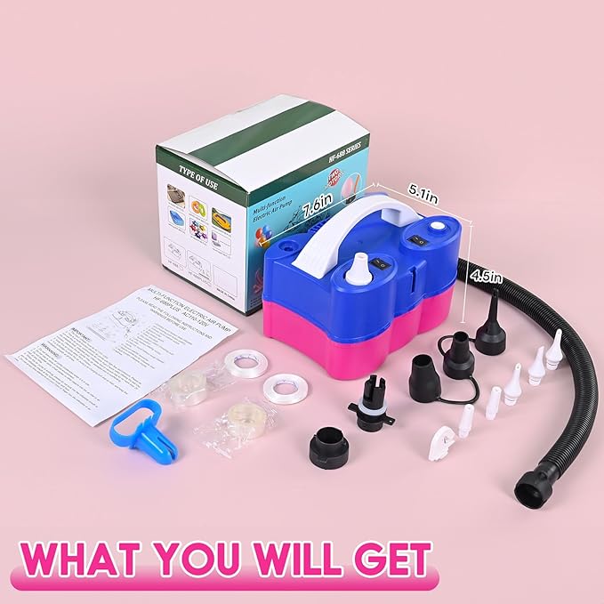 - 3-IN-1 Electric Balloons Pump: With this AC 110V-120V 600w electric air pump, youโll receive everything you need for inflating various inflatables. You Will get 1 electric air pump with dual inflation ports and deflation port, 2 flat nozzles, 2 angled nozzles, 1 long bellow, 5 nozzles for inflating and deflating,1 balloon tying tool, 2 ribbons, and 2 balloon garland tool strips for easy party setup, a built-in removable balloon cutter for quick and effortless balloon cutting.