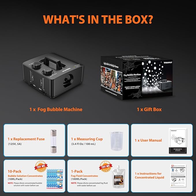 - 【High Output 5000+ Fog Bubbles】Fog Filled Bubbles Machine Can Generate More Than 5000+ Bubbles Per Minute with Super Built-in Motor. It Can Blow Tons of Colorful Bubbles or Amazing Foggy Bubbles Faster, Higher and Farther Even Inside with No Wind