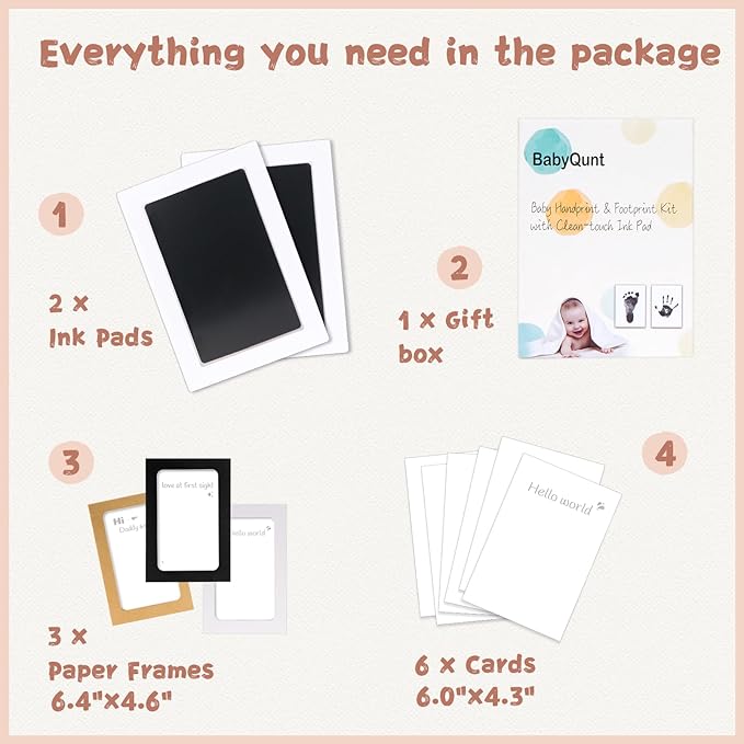 - 【Product Details】: Our baby hand and footprint kit measures 6.0"x4.2" with an ink window of 4.9"x3.1", which is the best size for recording hand and footprints of newborns 0-6 months old or pet paw prints . The ink pad for baby hand and footprints includes 2 clean touch ink pads, 6 stamping cards, and 3 display frames, ensuring you have ample opportunity to capture the best stamp.